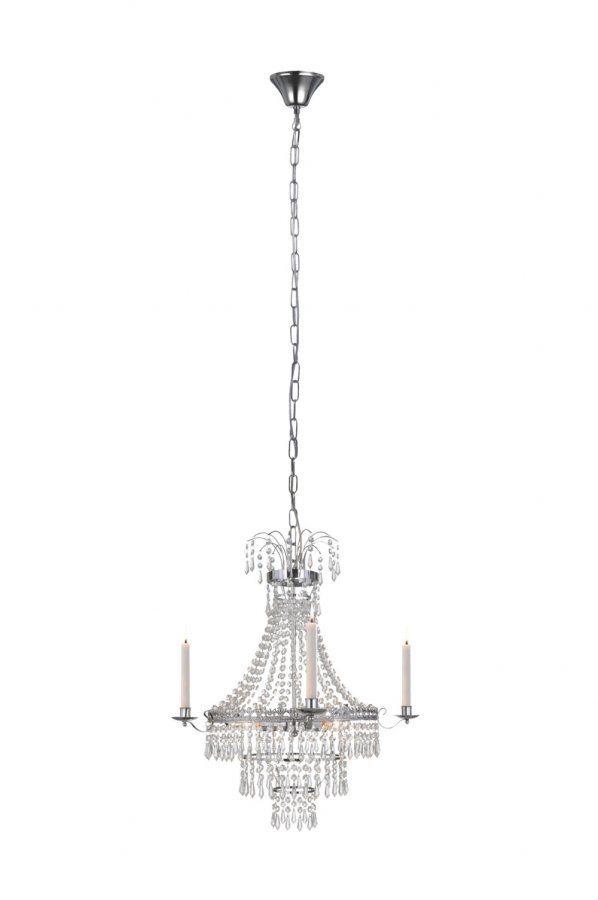 Markslöjd Marielund -kristallikruunu. Runko metallia. Konehiotut prismat. 1,2 m:n ketju ja kattokuppi koukkuripustusta varten. Maadoitettu liitäntä. Pieni lampunkanta E14. Enintään 40 W:n hehkulamppu tai vastaava halogeeni-, energiansäästö- tai LED-lamppu.