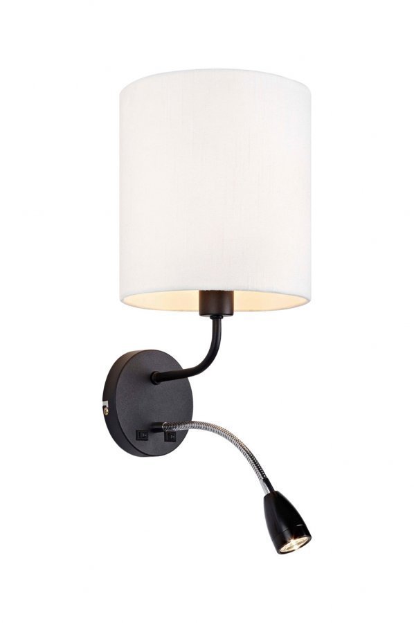 Markslöjd Mason -seinävalaisin. 2 metrin pituinen johto ja kangasvarjostin. E27-lampunkanta isossa valaisimessa, LED-lamppu lukuvalaisimessa. Pituus 19 cm, leveys 21,5 cm, korkeus 48 cm.