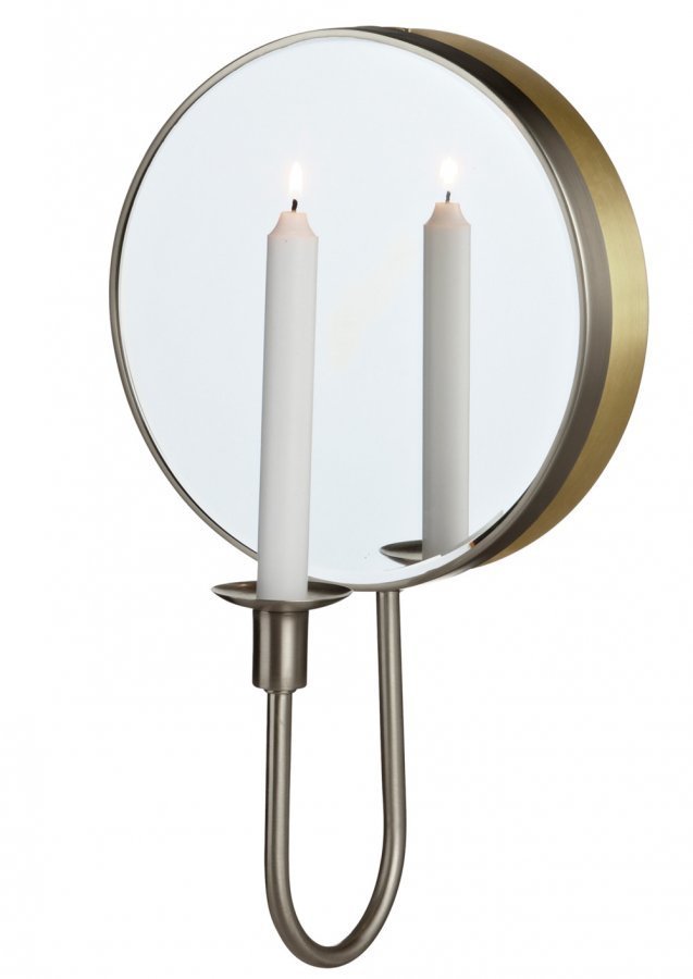 Mitat: Leveys 25 cm. Syvyys 15,5 cm. Korkeus 43 cm. Seinäpeili, jossa valo sekä paikka kynttilälle.