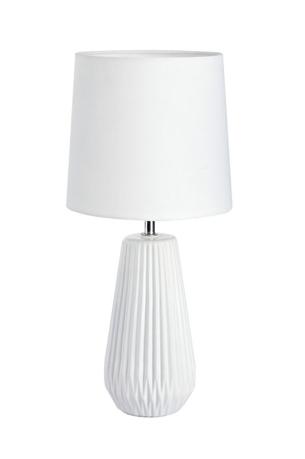 Markslöjd. Nicci -pöytävalaisin. Valkoinen keramiikkajalka ja kangasvarjostin. 1,5 metrin pituinen kangaspäällysteinen johto, jossa virtakytkin. E14-lampunpidike. Pituus 19 cm, leveys 19 cm, korkeus 41 cm.