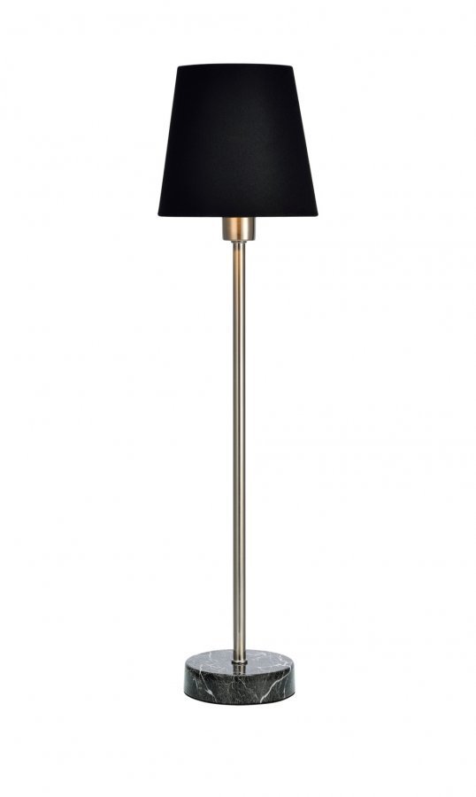 Pöytävalaisin, jonka leveys 14 cm, syvyys 14 cm ja korkeus 53 cm. Lampunkanta E14. Varjostin kangasta. Lampunjalassa painettu marmorikuvio.