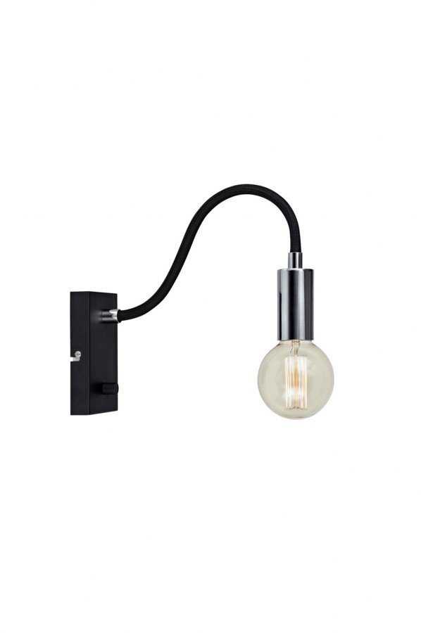 Markslöjd Raw -seinävalaisin kromia ja mustaa metallia. Säädettävä varsi. Kiinteä asennus kaariliitännällä. E27. Pituus 9 cm, leveys 33 cm, korkeus 24 cm.