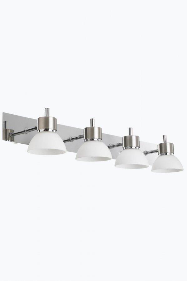 Mitat: leveys 14 cm, syvyys 63 cm, korkeus 12 cm. Kromia ja huurrelasia. Tyylikäs valaisin kylpyhuoneeseen.