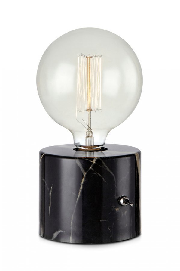 Markslöjd Round -pöytävalaisin, jossa marmorikuvioinen painatus. Sisäänrakennettu virtakytkin. 2 metrin pituinen musta kangaspäällysteinen johto. Lampunpidike E27, lamppu ei mukana. Pituus 12 cm, leveys 12 cm, korkeus 10 cm.