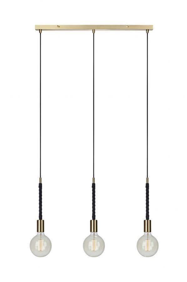 Markslöjd Saddle -kattovalaisin messinkiä ja nahkaa. 3xE27-lampunkantaa. 1,5 metrin pituiset mustat kangaspäällysteiset johdot. Lamput eivät mukana. Pituus 68 cm, leveys 4,5 cm, korkeus 22 cm.