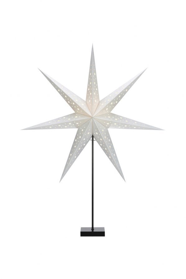 Solvalla-pöytätähti. Tähti paperia. Korkeus 100 cm, leveys 75 cm. Lampunjalka puuta ja metallia, leveys 12 cm. E14-lampunkanta, enintään 25 W. 2 metrin pituinen johto, jossa virtakytkin.