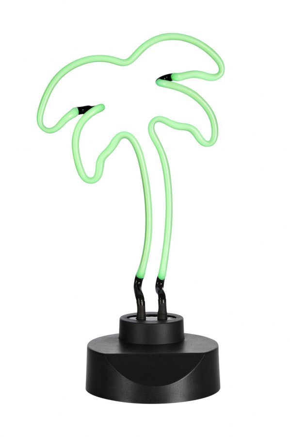 Texas Neon Palm -pöytävalaisin ja muuntaja. Leveys 14 cm, korkeus 37 cm. Enintään 6 W. Johdon pituus 3 metriä.
