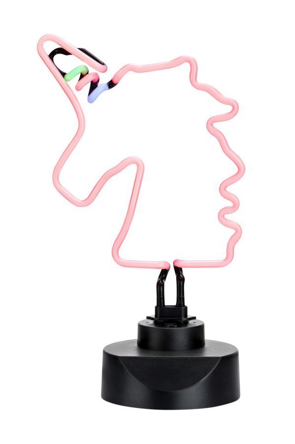 Yksisarvisen muotoinen Texas Neon -pöytävalaisin. Leveys 14 cm, korkeus 37 cm. Muuntaja. Enintään 6 W. Johdon pituus 3 metriä.