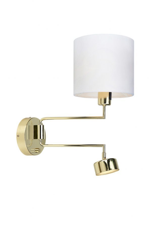 Markslöjd-Thelma-seinävalaisin, jossa kaksi valoa. Messinginvärinen seinäkiinnike ja valkoinen kangasvarjostin. Alempi valaisin on himmennettävä ja suunnattava. Ylempi valaisin on suunnattava mutta ei himmennettävä. Virtakytkin lampunpidikkeessä. 2 m:n läpikuultava johto. Leveys 20 cm Korkeus 44 cm Syvyys 40 cm Teho 60 W + 5 W Lampunkanta E27 + LED