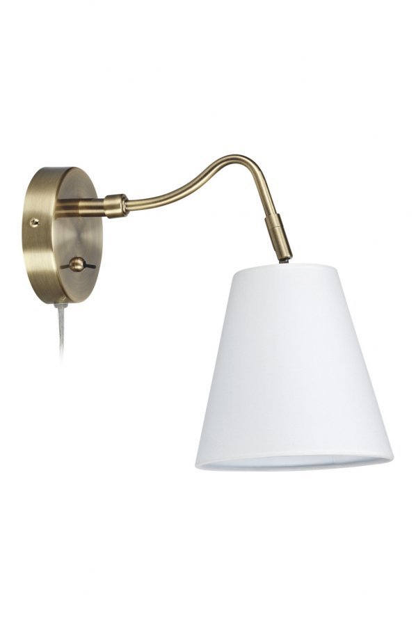Markslöjd Tindra -seinävalaisin. Antiikkimessinginvärinen jalka ja valkoinen kangasvarjostin. E14, enintään 40 W. Valonlähde ei mukana.