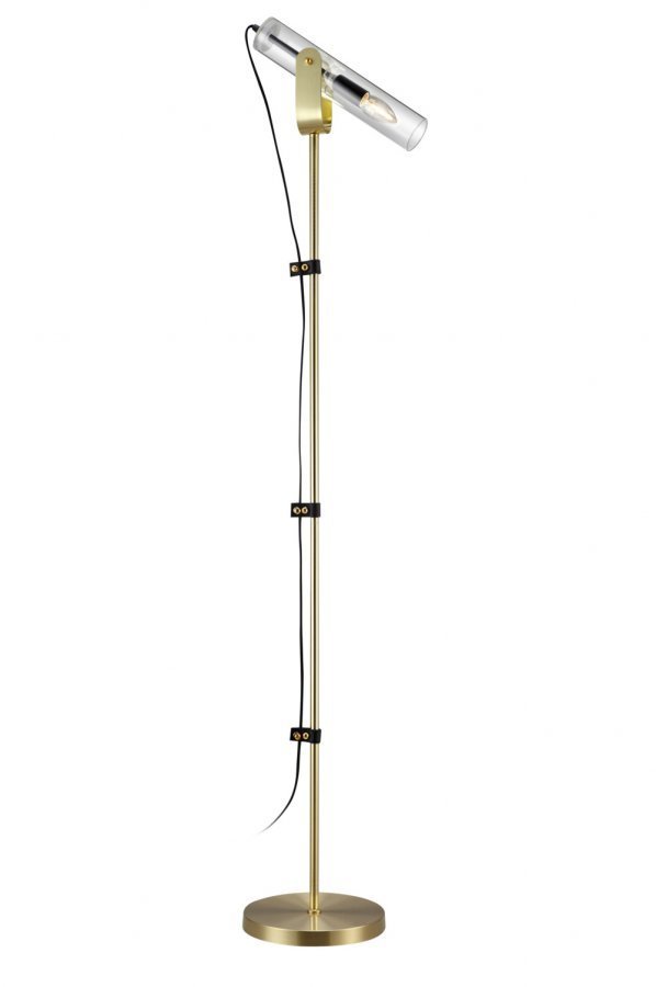 Markslöjd Winston -lattiavalaisin. Runko messinkiä ja varjostin kirkasta lasia. Lampunkanta E14. Lamppu ei mukana. Musta kangasjohto.