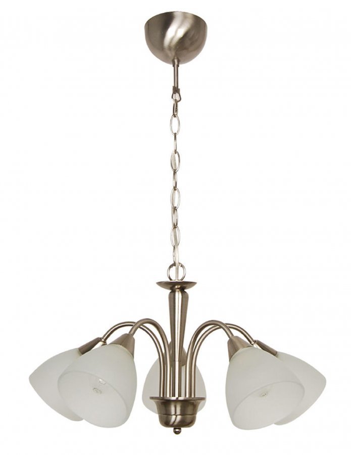 Yksinkertaisen tyylikäs viisihaarainen peruskruunu moneen käyttötarkoitukseen, esimerkiksi makuu- tai olohuoneeseen. Satiinikromisen rungon ja hapotettujen lasikupujen yhdistelmä luo ajatonta tunnelmaa. Valaisimessa on valmiiksi kattopistotulppa, jonka ansiosta se on helppo asentaa kattoon. Valaisimen suuri kattokuppi peittää koko kattopistorasian.