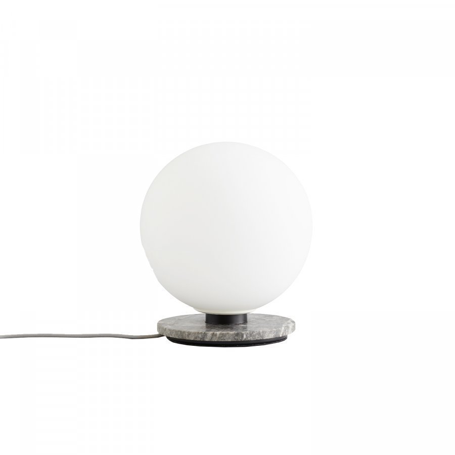 TR Bulb pöytä-/kattovalaisin Menulta, suunnittelijana Tim Rundle. Tämä valaisin on älykäs ratkaisu moderniin kaupunkielämään. Valaisin on saanut innoituksensa urbaanista elämäntavasta, jossa ihmiset muuttavat eri syistä yhä useammin kaupungista ja maasta toiseen. Himmennettävä, elegantin pallomainen LED-lamppu kätkee sisäänsä lampun liitäntäosat. Opaalilasikupu antaa tasaisen, harmonisen hehkun, mikä estää häikäisyn ja antaa upean valon. Valaisimen jalka on harmaata marmoria, ja se voidaan asentaa seinälle, kattoon tai pöytälampuksi. Valonlähde ei sisälly toimitukseen.