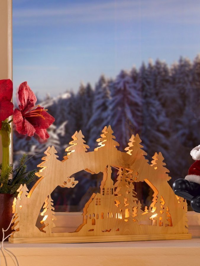 Perinteinen saksalainen sähkökynttelikkö. Kaaren reunassa kuusia, alaosassa kirkko. 10 valoa. Johdon pituus n. 150 cm. Ei päälle-/pois-painiketta eikä muuntajaa. Materiaali mäntyä. Mitat (KxLxS) n. 33 x 54,5 x 5 cm. 230 V, 8,4 W.