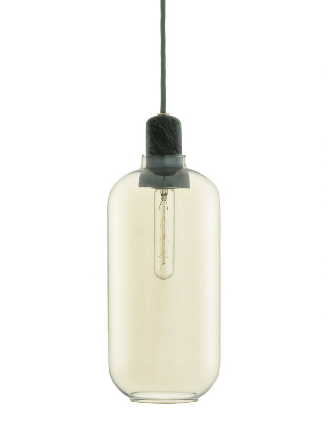 Amp on sarja lasi- ja marmorivalaisimia, jotka ovat vahvasti saaneet vaikutteita 60-luvun hi-fi-laitteista. Valaisimen laadukkaat materiaalit luovat mielenkiintoisen visuaalisen ilmeen, jossa herkkyys ja aisteja hivelevä raskas tuntu kohtaavat. Amp on sekä nostalginen että ajankohtainen. Valaisimeen sopii 25 W:n polttimo, joka ei sisälly pakkaukseen. Riippuvalaisimessa on 4 metrin johto ja johtokiinnitysten peittämiseen tarkoitettu kupu. Korkeus on 26 cm, halkaisija 11,2 cm ja paino 637 grammaa.