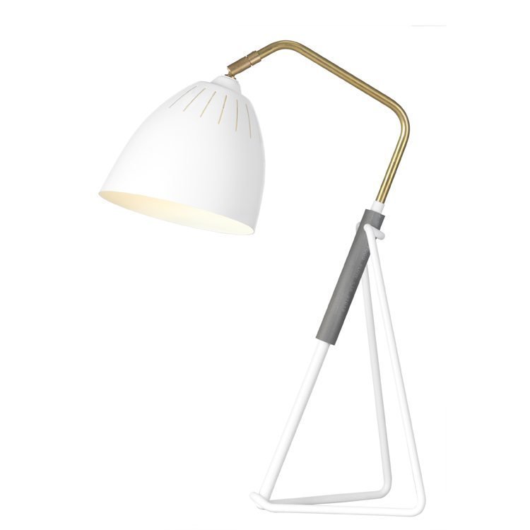Lean pöytävalaisin Örsjö Belysningiltä. Valaisin kallistuu taaksepäin juuri samalla tavalla, kuin saman sarjan lattiavalaisinkin. 50-lukua henkivä muotoilu, mutta silti moderni ilme koostuu raakamessingin, jauhemaalatun metallin ja kumin yhdistelmästä. Suunnittelu Jenny Bäck.