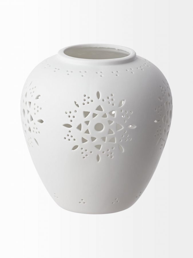 Keraamisessa lämpökynttilälyhdyssä on kaunis reikäkuviointi. Lyhdyn mitat ovat 15 x 16 cm.