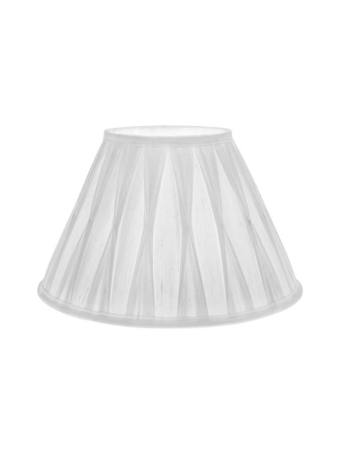 Silkkipäällysteistä varjostinta koristavat vekit. Lampunvarjostimen halkaisija on 35 cm ja korkeus 22,5 cm.