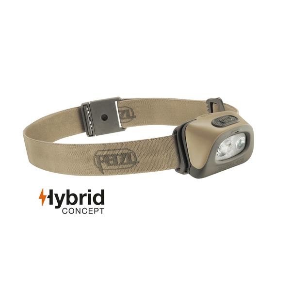 Suorituskykyinen ja pieni LED otsavalaisin valkoisella yhdistelmävalolla sekä punaisella, vihreällä ja sinisellä valolla. Aavikkoväritys. Hybrid Concept: Toimii sekä kolmella AAA -sormiparistolla (sis.) että ladattavalla Petzl Core -akulla. Valovirta 250 lumenia. Pitkä paloaika. Tuo valon aina katseen suuntaan ja jättää molemmat kädet vapaiksi. Otsapannassa pikasolki, jonka ansiosta valaisin voidaan laittaa esim. kaulaan ilman tarvetta ottaa kypärää päästä. Soveltuu yleiskäyttöön lähivalaisutarpeisiin: Työhön, sotilaskäyttöön, metsästykseen, kalastukseen, luonnon tarkkailuun jne. olosuhteisiin missä ei haluta arkoja, helposti likaantuvia materiaaleja, tai kun käyttäjän havaitsemattomuus on tärkeää. Valkoinen valo: Kolme kirkkautta. Näyttää samanaikaisesti lähelle leveän valokeilan ja kauas kapean valokeilan. Punainen valo: Säilyttää parhaiten hämäränäön kenttäkäytössä ja vähentää lähellä liikkuvien häikäistymistä. Vihreä valo: Tarjoaa parhaan erottelukyvyn, ja silmät palautuvat nopeimmin (mistä syystä sitä käytetään ilmailussa, lentokoneissa ja helikoptereissa) Sininen valo: Vaikeimmin havaittavissa paljaalla silmällä etäältä, ja sillä voi myös seurata verijälkeä sekä havaita tulehduksen haavassa. Värivaloissa vilkkutoiminto, joka ilmoittaa käyttäjän sijainnin. Kantama max: 70 m. Paloaika eco: 260 h. Painonappikytkin, jota on helppo käyttää myös käsineet kädessä. Kytkimen muotoilun ansiosta valaisin ei mene tarkoituksettomasti päälle (esim. taskussa, työkalupakissa tai varusterepussa). Valokulman korkeuden säätönivel. Elastinen, säädettävä ja konepesun kestävä Petzl Long Life otsapanta. Kontaktipinnat ruostumatonta terästä. Paristokotelo helposti avattavissa paristojen vaihtoa varten. Voidaan käyttää myös AAA Ni-Mh akuilla. Paino: 88 g (3xAAA LR03 paristoilla). Vesitiiviys: IPX4 Roiskeveden kestävä. Materiaali- ja valmistusvirhetakuu 5 vuotta. CE. Lisävarusteet: Core li-ion akku (Micro USB latausliitin): E99ACA Adapt Kit (Kypärään liimattava kiinnikelevy ja Adapt kansi paristokoteloon): E93001 Fixation Tactikka (Kiinnikelevy Petzl Vertex ja Alveo työkypärien etukoloon): E093CA00 Kypäräkiinnikesarja 4 x tavutettava koukku (esim. työkypäriin, kiipeilykypäriin ja pyöräilykypäriin): E04405 Kypäräkiinnikesarja 4 x kiinteä koukku (kypäriin, joissa on kapea alareuna): E04350 Poche kuljetuskotelo (Jolla valaisin voidaan kuljettaa vyöllä, valjaissa tms. paikassa josta se on helposti otettavissa käyttöön): E93990 Noctilight lyhtykuori (Pöydälle asetettava tai ripustettava kuljetuskotelo / valaisimen 360-asteen lyhdyksi muuttava kuori): E093DA00