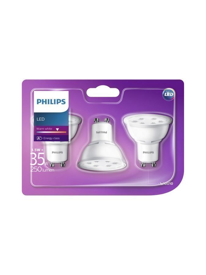 LED-polttimossa on lämmin valo, jonka Kelvin-arvo on 2700. LED-lampun energiatehokkuusluokka on A . Valo syttyy heti ja tuottaa täyden kirkkautensa heti sytytettäessä. Jopa 15 vuotta kestävässä LED-lampussa on GU10-kanta.Pakkauksessa on kolme polttimoa.