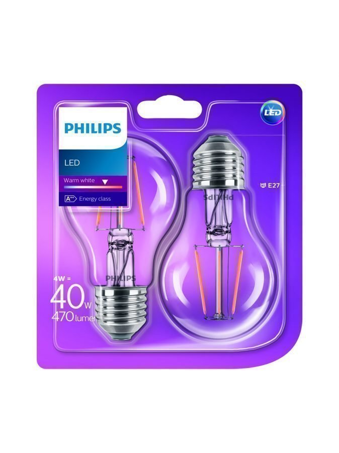 Pakkauksessa on kaksi lämpimänvalkoista 4 W LED-lamppua, joissa on 40 W teho ja E27-kanta. Valoteho 470 luumenia.
