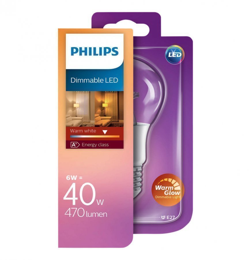 LED Lamppu 6W (40W) E27 A60 warm glow, 470LM, 2200-2700K, 230V. Philipsin lämpimän valkoisella lampulla teet kotiisi taianomaisen ja miellyttävän tunnelmavalaistuksen helposti himmentämällä. Lamppujen teknisten ominaisuuksien ansiosta valo jakautuu tasaisesti huoneeseen ja valaisee sen kauttaaltaan.