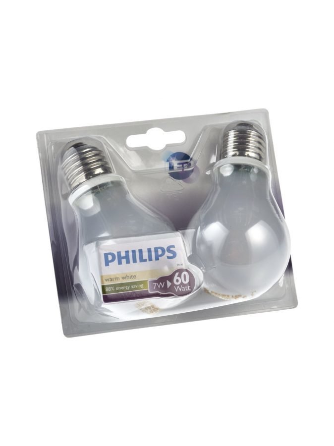 Lämpimänvalkoinen energiansäästölamppu säästää energiaa jopa 88 %. 7 W:n teho vastaa perinteistä 60 W hehkulamppua. Pakkauksessa on kaksi LED-lamppua, joissa on E27-kanta. A60, 2700K.