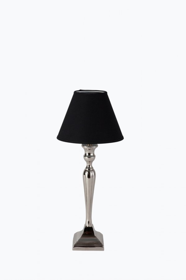 Krominvärinen, metallinen jalka, korkeus 42 cm, leveys 10 cm. E27, enintään 40 W. 1,8 m:n johto, jossa katkaisin. Svea-varjostin, halkaisija 21/10 cm, korkeus 15,5 cm. Mustaa, laminoitua polyesteriä. Kokonaiskorkeus 50 cm.