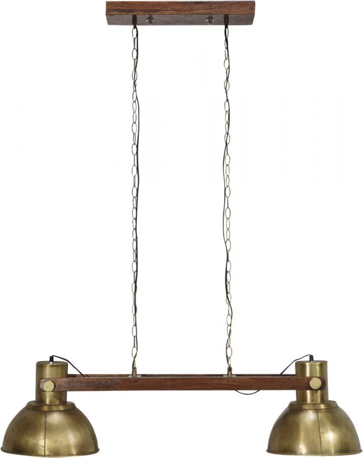 Kaksilamppuinen kattovalaisin rustiikkia metallia, puudetalji. 110 cm leveä, 1,1 m ketju. E27/iso lampunkanta, 40 W.