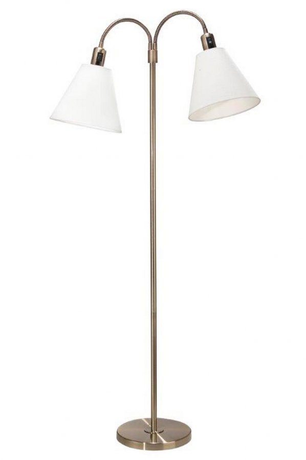 Lattiavalaisin, jossa kaksi taivutettavaa vartta, virtakytkin varressa. Korkeus 160 cm. Halkaisija 27 cm. E27. 40 W. Kaksi pellavavarjostinta. Varjostimen koko, korkeus 19 cm, halkaisija 22/9 cm.