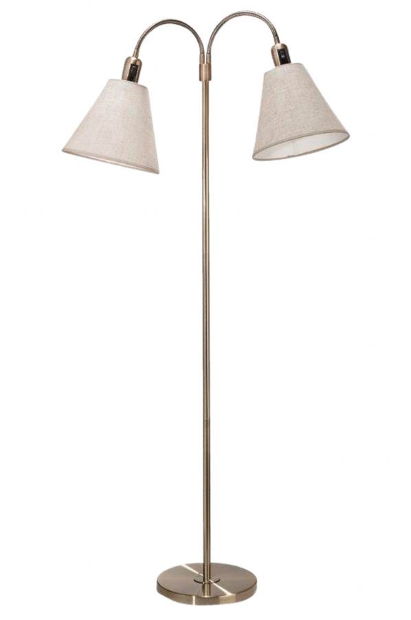 Lattiavalaisin, jossa kaksi taivutettavaa vartta, virtakytkin varressa. Korkeus 160 cm. Halkaisija 27 cm. E27. 40 W. Kaksi pellavavarjostinta. Varjostimen koko, korkeus 19 cm, halkaisija 22/9 cm.