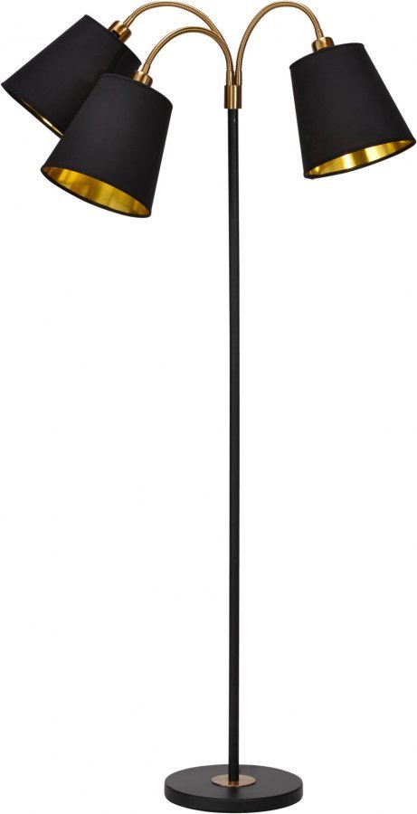 Cia-lattiavalaisin, 3-haarainen. Katkaisin varressa. Korkeus 160 cm, halkaisija 27 cm. E27, enintään 40 W. 3 mustaa/kullanväristä Cia-varjostinta. Korkeus 19 cm, halkaisija 20/13 cm.