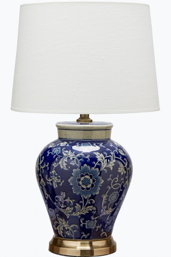 Fang Hong -pöytävalaisin posliinia. Korkeus 38 cm, halkaisija 22,5 cm. Messinginväriset detaljit jalassa ja lampunkannassa. E27, enintään 40 W. Musta liitäntäjohto. Mukana luonnonvalkoinen Sofia-varjostin. Korkeus 25 cm, halkaisija 35/30 cm. Rengaskiinnike E27.