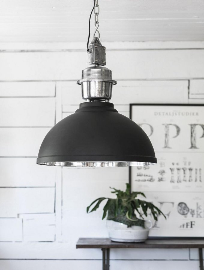 Kattovalaisin metallia, mukana kruunupistoke. Metallinen kattokuppi, jossa kiinnike kattokoukkua varten. Hopeanvärinen sisäpinta. Halkaisija 52 cm, korkeus 56 cm. Johdon pituus 100 cm. E27, enintään 40 W.