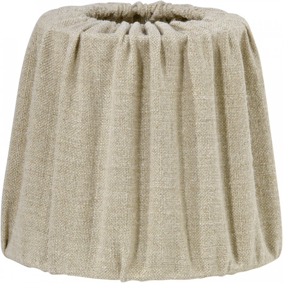 Mia-lampunvarjostin. Pyöreä, laskostettu varjostin 100% kivipestyä pellavaa. Korkeus 15 cm. Halkaisija alhaalta 17 cm, ylhäältä 12,5 cm. Pallolampun kiinnike 5 cm alareunasta.
