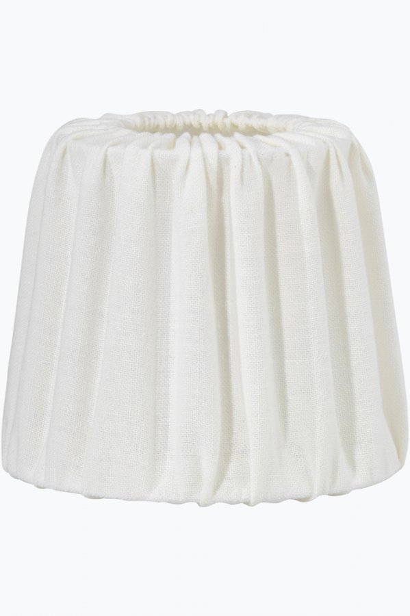 Mia-varjostin. Pyöreä laskostettu lampunvarjostin 100% kivipestyä pellavakangasta. Korkeus 15 cm. Alareunan halkaisija 17 cm, yläreunan 12,5 cm. Pallolampun kiinnike 5 cm alareunasta. 100% pellavaa