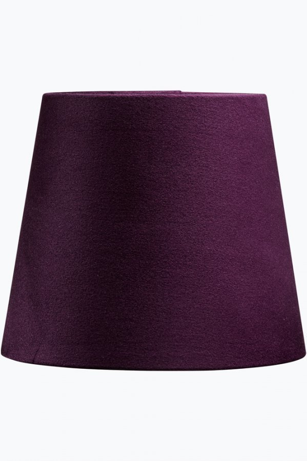 Mia-varjostin. Pyöreä lampunvarjostin sileää samettia. Korkeus 14,5 cm. Alareunan halkaisija 17,5 cm, yläreunan 13 cm. Pallolampun kiinnike 5,5 cm alareunasta. 100% polyesteriä