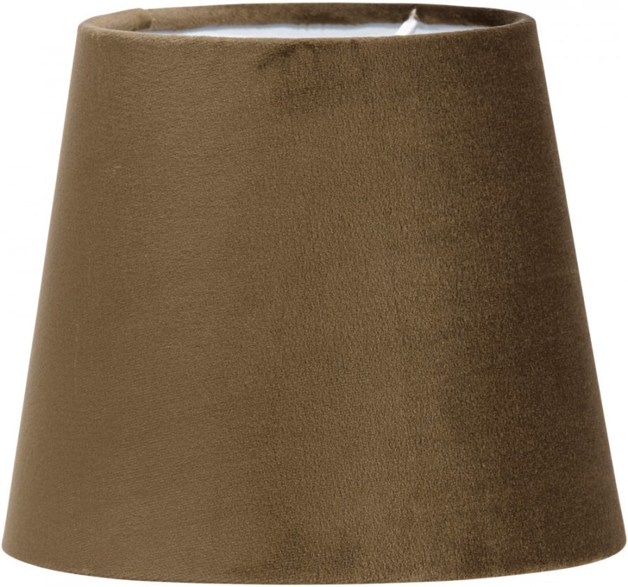 Mia-varjostin. Pyöreä lampunvarjostin sileää samettia. Korkeus 17 cm. Alareunan halkaisija 20 cm, yläreunan 14,5 cm. Pallolampun kiinnike 7 cm alareunasta.