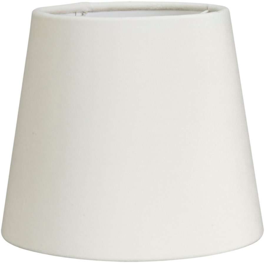 Mia-varjostin. Pyöreä lampunvarjostin sileää samettia. Korkeus 14,5 cm. Alareunan halkaisija 17,5 cm, yläreunan 13 cm. Pallolampun kiinnike 5,5 cm alareunasta.