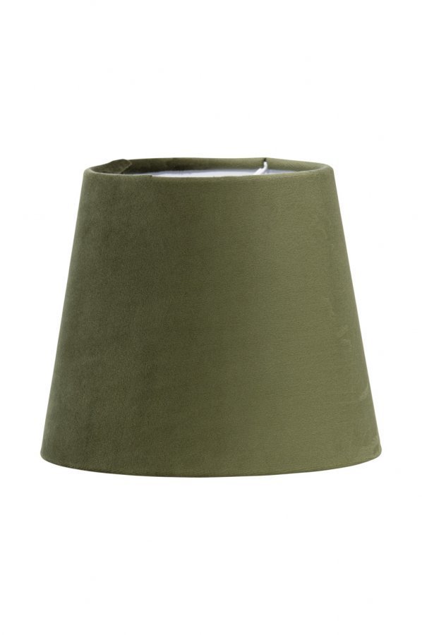 Mia-varjostin. Pyöreä lampunvarjostin sileää samettia. Korkeus 14,5 cm. Alareunan halkaisija 17,5 cm, yläreunan 13 cm. Pallolampun kiinnike 5,5 cm alareunasta.