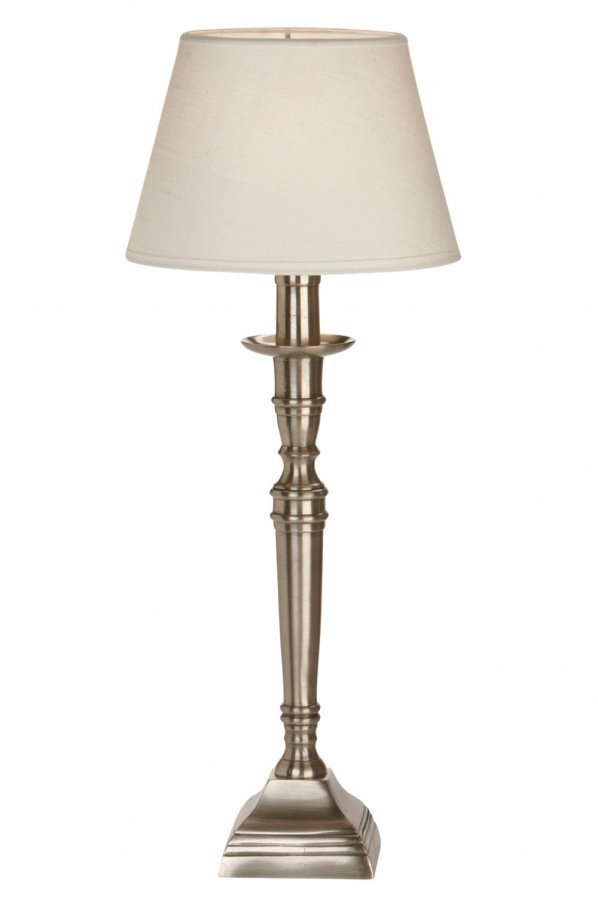 Metallinen, antiikkihopeanvärinen lampunjalka. Korkeus 42 cm, leveys 10 cm. 1,8 m:n johto, jossa virtakytkin. E27, enintään 40 W. Oval-varjostin, halkaisija 20/13 cm, korkeus 14 cm. Valkoista laminoitua pellavaa. Kokonaiskorkeus 49 cm.