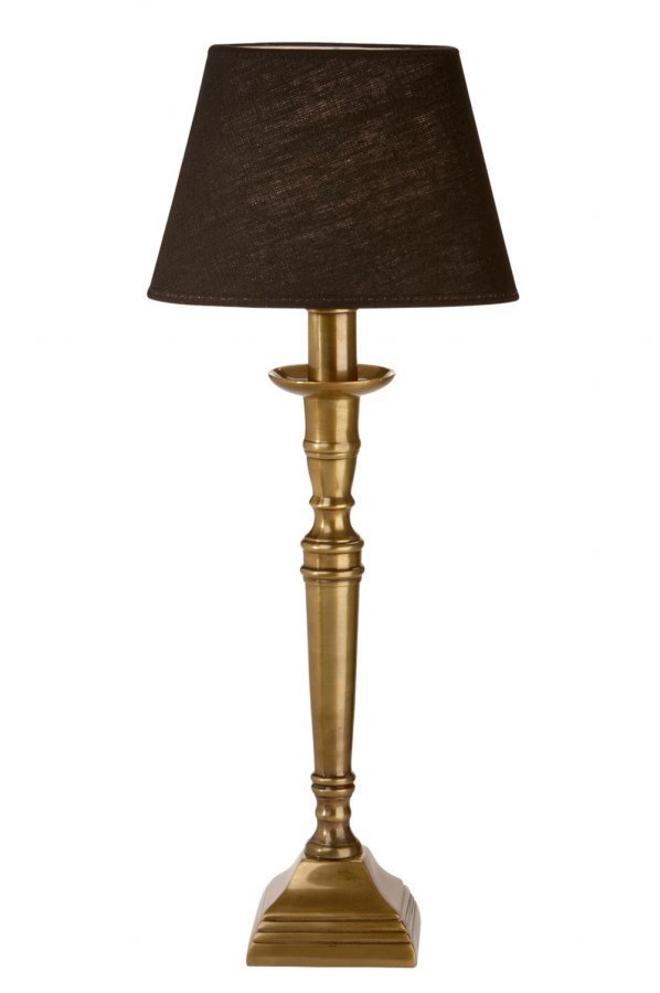 Lampunjalka antiikkimessingin väristä metallia, korkeus 42 cm, leveys 10 cm. E27, enintään 40 W. 1,8 m:n liitäntäjohto, jossa katkaisin. Soikea varjostin, halkaisija 20/13 cm, korkeus 14 cm. Mustaa laminoitua pellavakangasta. Kokonaiskorkeus 49 cm.