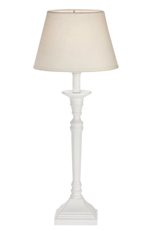 Lampunjalka valkoista polyresiiniä, korkeus 42 cm, leveys 10 cm. E14, enintään 40 W. 1,8 m:n liitäntäjohto, jossa katkaisin. Soikea varjostin, halkaisija 20/13 cm, korkeus 14 cm. Valkoista laminoitua pellavakangasta. Kokonaiskorkeus 49 cm.