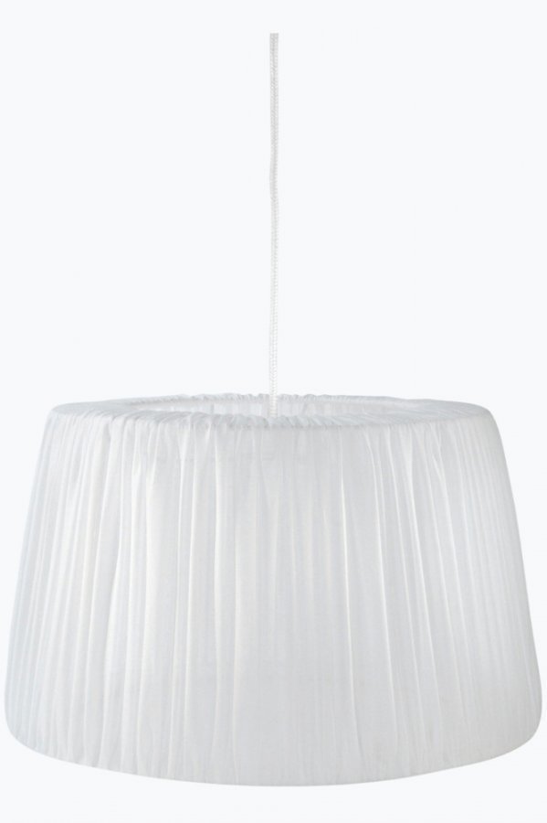 Kattovalaisin poimutettua puuvillaa. Pyöreä, halkaisija 50 cm. Korkeus 30 cm. Valkoinen johto 1,2 m. Kruunupistoke. Kattokuppi valkoista muovia. E27. Enintään 60 W.