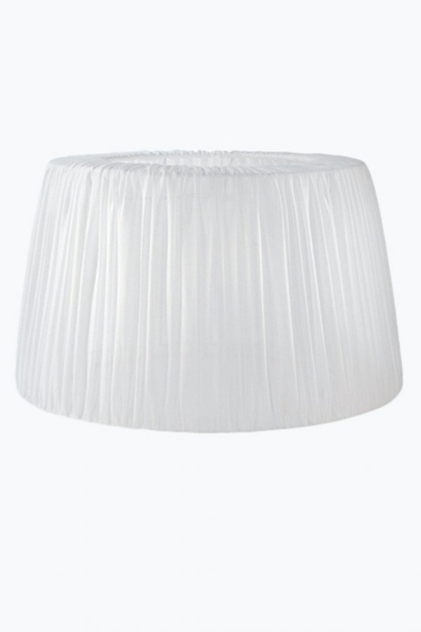 Kattovalaisin poimutettua puuvillaa. Pyöreä, halkaisija 40 cm. Korkeus 24 cm. Valkoinen johto 1,2 m. Kruunupistoke. Kattokuppi valkoista muovia. E27. Enintään 60 W.