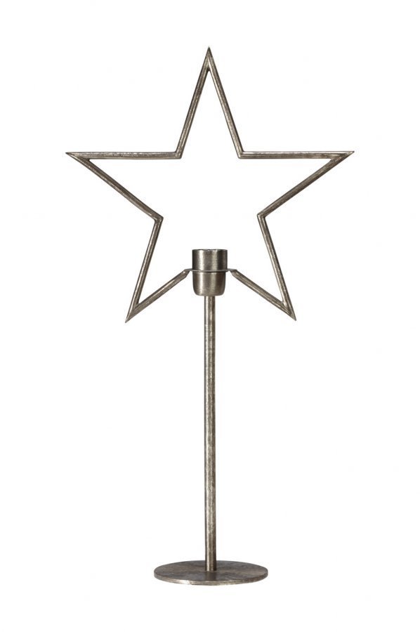 Jalallinen valotähti metallia. Korkeus 65 cm, leveys 35 cm, syvyys 14 cm. E27/iso lampunkanta. Enintään 40 W. Musta kangasjohto, jossa virtakytkin. Valonlähde ei ole mukana.