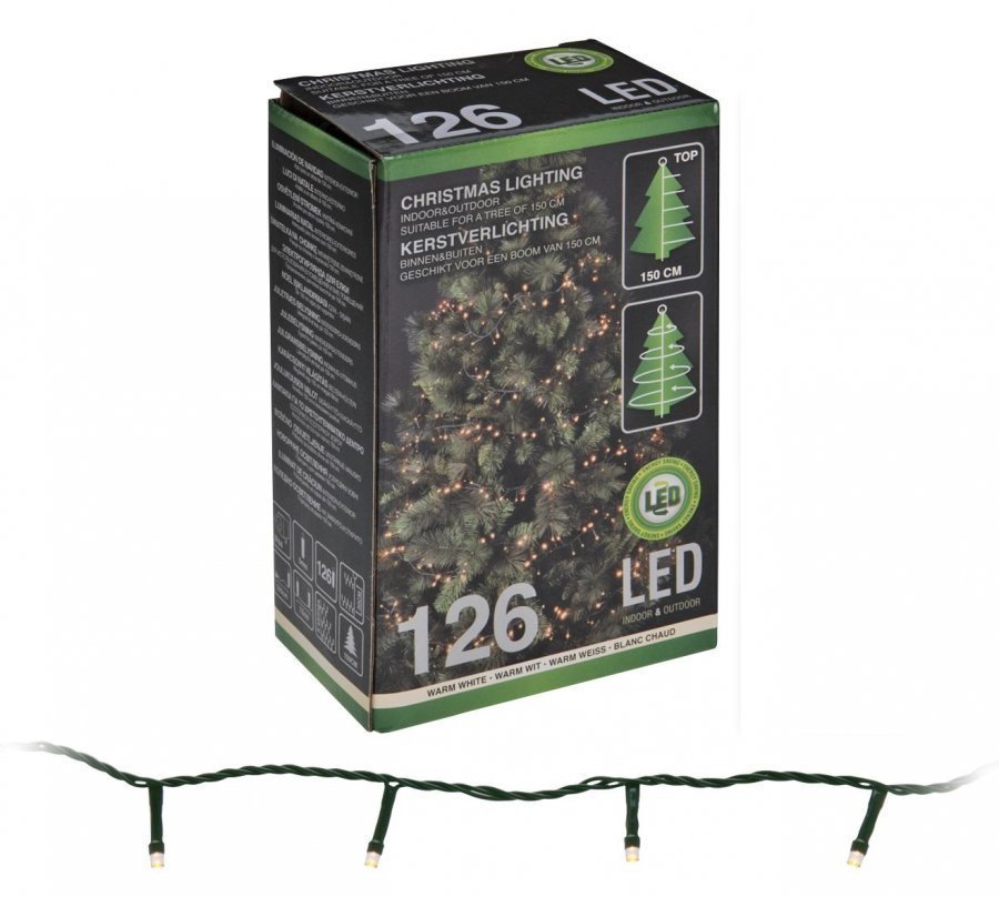 126-osainen puuhun ripustettava led-valosarja ulkokäyttöön. Riittää noin 1,5 m pituiseen kuuseen. – väri