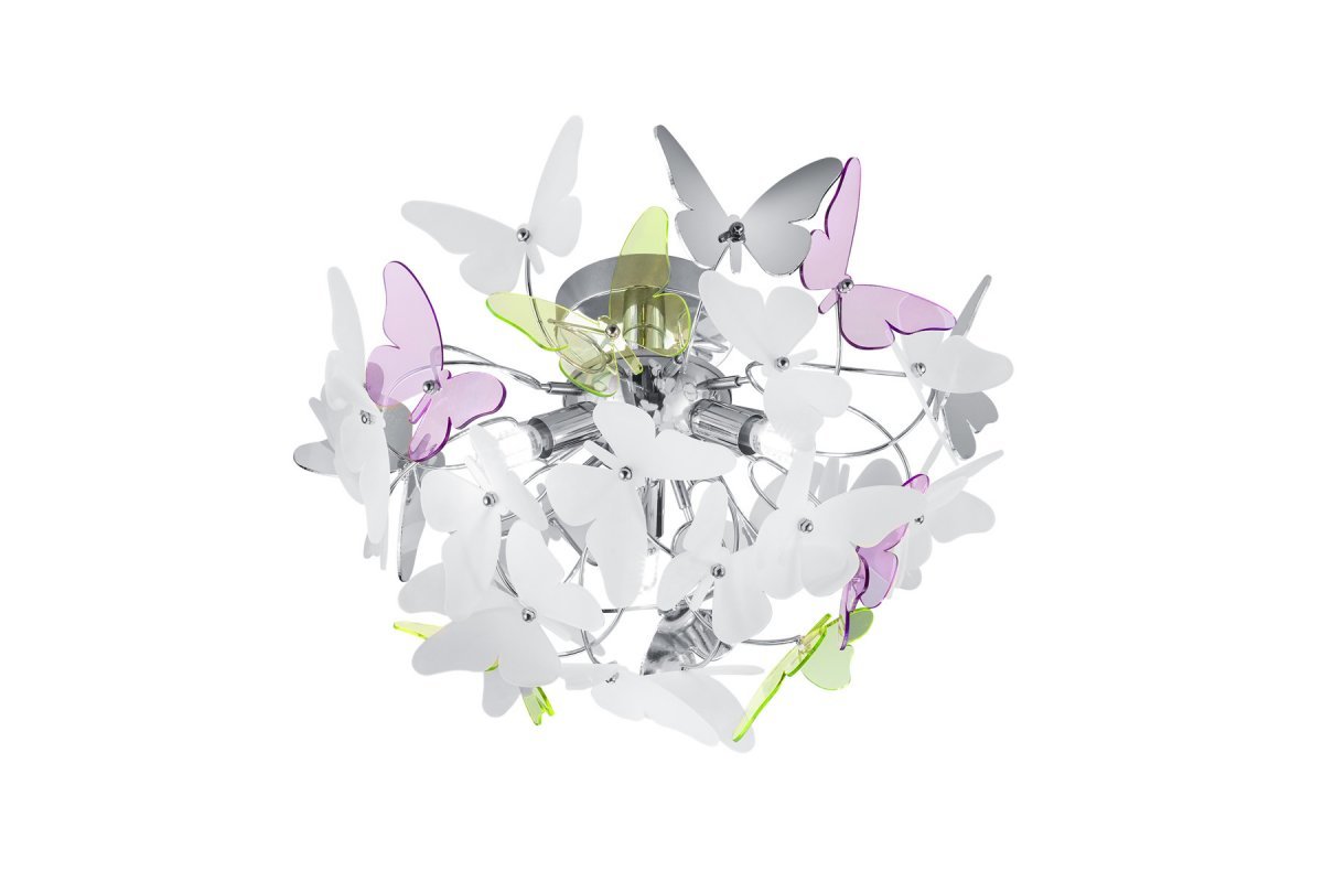 Butterfly kattovalaisimen runko on kromia ja koristeena akryyliset perhoskoristeet. Valaisimen mukana tulee valkoisia, vihreitä, liloja ja kromin värisiä perhosia. Voit halutessasi tehdä valaisimesta kokonaan valkoisen tai lisätä värillisiä perhosia mukaan. Valaisimessa on kolme G9-kantaa, polttimot ei sisälly pakkaukseen. Korkeus 28,5 cm ja halkaisija 45 cm. 3xG9 max 28 W (polttimo ei sisälly)Korkeus 28,5 cmHalkaisija 45 cmRunko metallia (kromi)Kupu akryyliä (valkoinen, vihreä, lila ja kromi)IP20Energialuokka A++-E