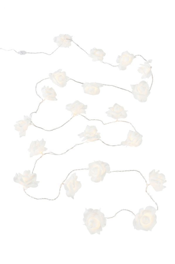 Valoköynnöksen voi sijoittaa mihin vain. Voidaan käyttää myös yövalona lastenhuoneessa. Materiaali: Muovia. Koko: Kokonaispituus 6 m, josta 3 m ruusuja. Kuvaus: 20 muoviruusua 15 cm:n välein. Hyväksytty sisäkäyttöön. IP20-muuntaja. Vinkki: Tunnelmavalaistus on yhtä tärkeä kuin yleisvalaistus. Normaalikokoisessa huoneessa tulee olla 6–8 valonlähdettä.