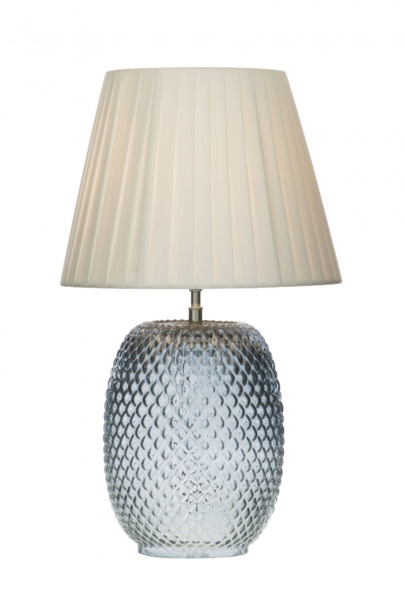 Scan Lamps Cornelia on todella kaunis,sinertävän hohtoinen, kuvioidusta lasista valmistettu pöytävalaisin, mukana valkoinen kangasvarjostin. Luo tunnelmaa tilaan kuin tilaan. Korkeus: 44 cm Halkaisija 25 cmLampunkanta: E14/Max 40 W Energialuokka: A++ – E Materiaali: Lasi/Tekstiili Väri: Sininen/Valkoinen